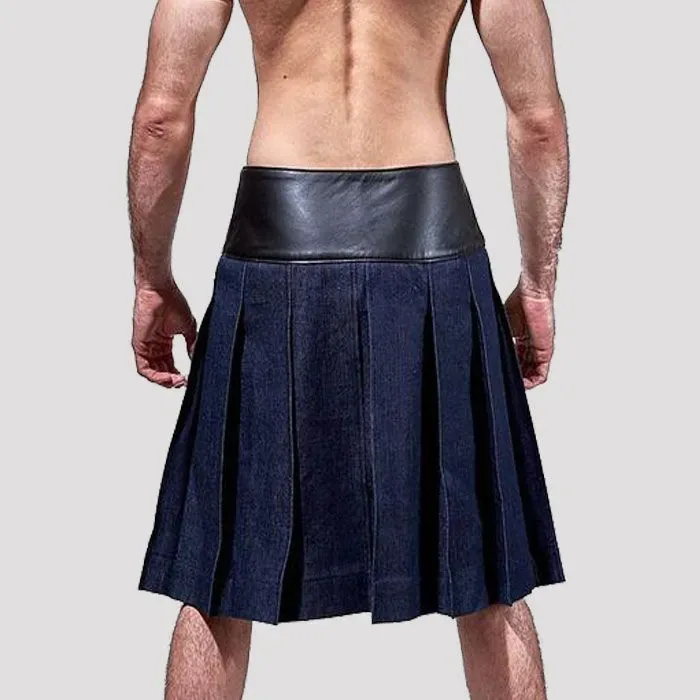 Blue Denim Leather Kilt With Leather Pouch